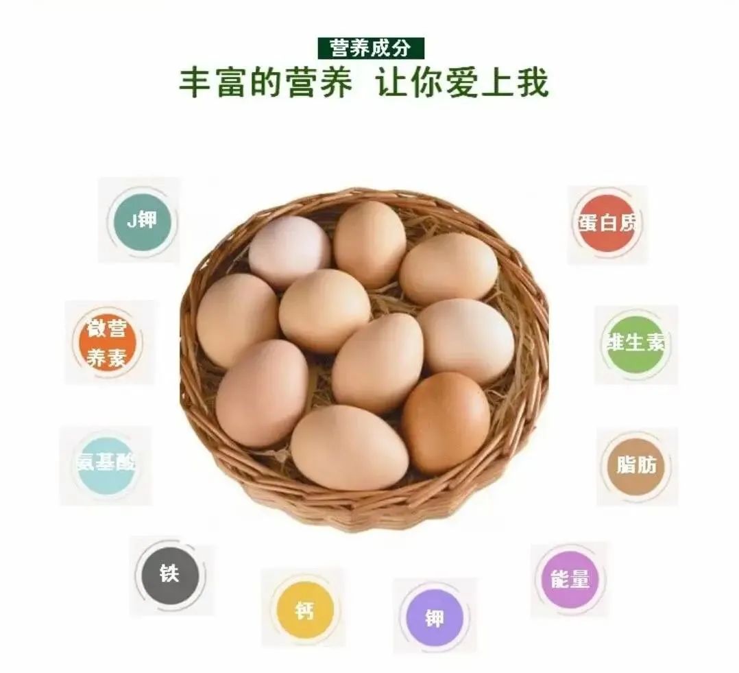 一枚雞蛋可提供大約6g優質蛋白,與一盒250ml牛奶所含的蛋白質含量接近。還富含多種維生素,如VA、VD、VE、VB12、核黃素、葉酸等,以及碘、鐵、磷、硒等許多微量元素。