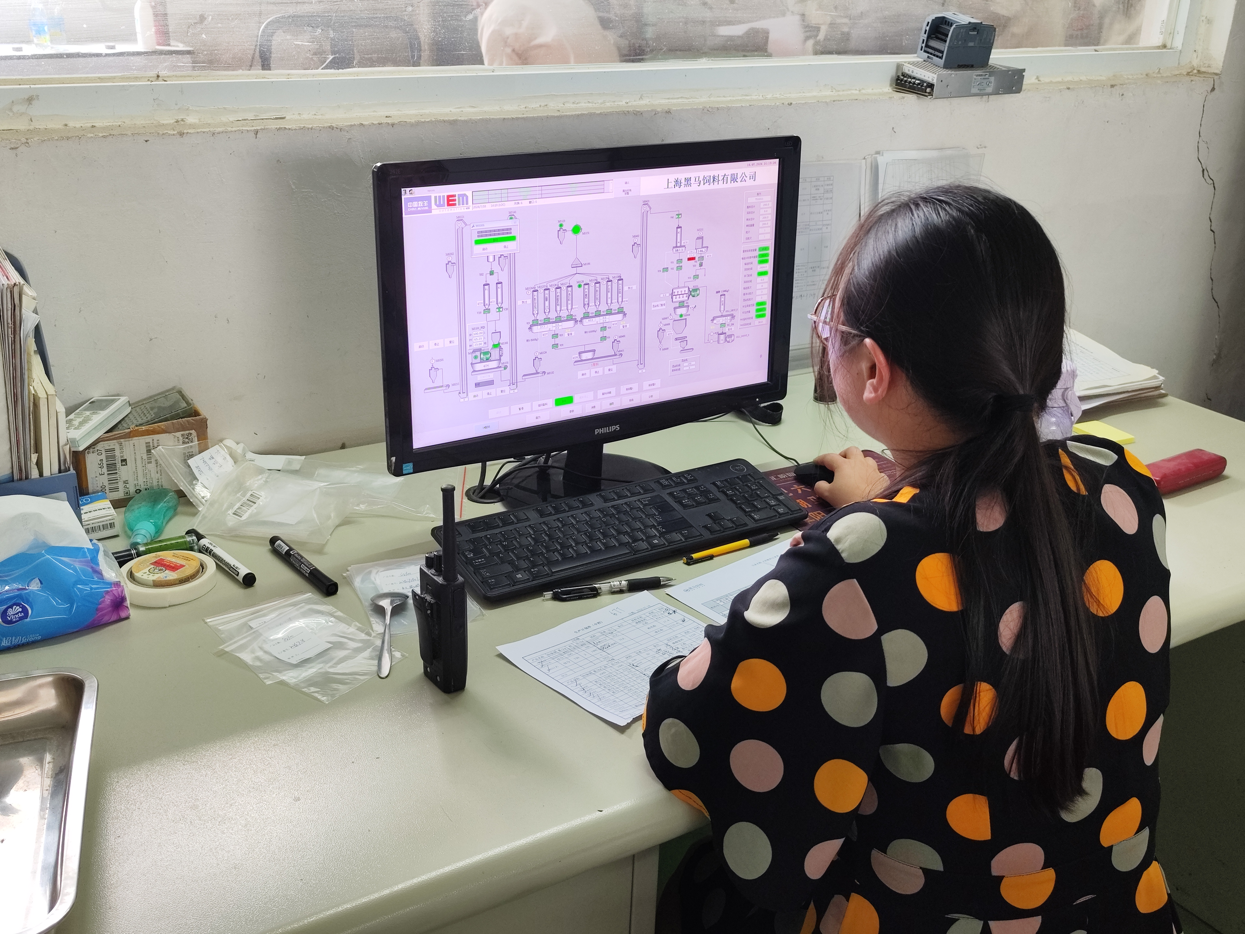 中控就如同整個(gè)生產(chǎn)流程的大腦,只有經(jīng)過(guò)它的授權(quán),一包包完整的飼料才能被生產(chǎn)出來(lái)。因此,在巡查的時(shí)候,要格外認(rèn)真。巡查內(nèi)容主要包括中控人員在崗情況、配料軟件與配方的核對(duì)、混合時(shí)間的設(shè)置工作記錄填寫(xiě)情況等。