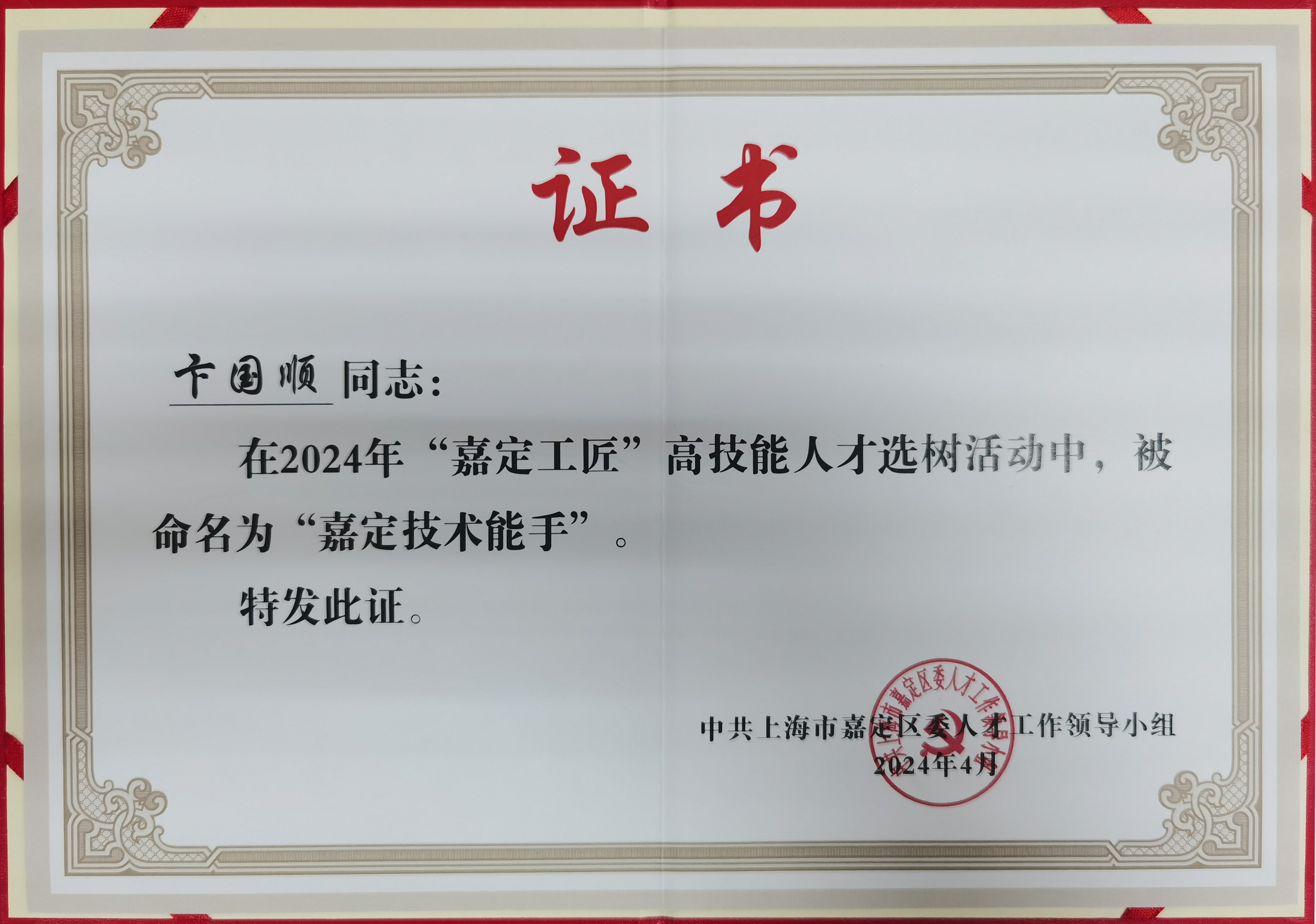 近日,在2024年“嘉定工匠”高技能人才選樹活動中,我司副總經(jīng)理卞國順先生被評為“嘉定技術(shù)能手”。
