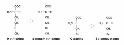 在酵母發酵過程中加入適量的無機硒,利用酵母對硒的富集效應,就能生產出有機形式硒。酵母硒中的有機硒包括硒代蛋氨酸、硒代胱氨酸、CH3SeH(甲基硒酸)、含硒蛋白質及其它硒化物。其中,硒代蛋氨酸占比最高,其次是硒代胱氨酸。這兩種硒化氨基酸的結構與常規氨基酸蛋氨酸(Met)和半胱氨酸(Cys)相同,只是硒取代了硫原子。