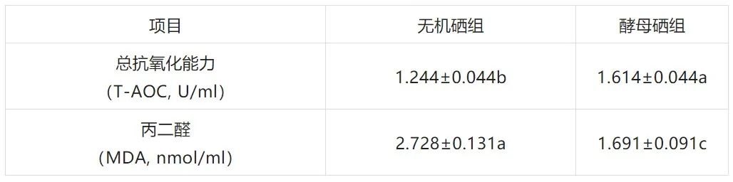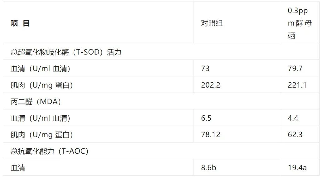 此外,下表中的數據顯示,酵母硒還能提高總超氧化物歧化酶的活力。