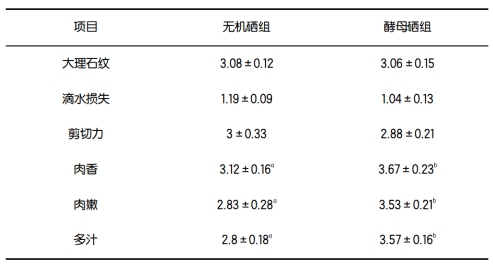 下表中,酵母硒組較無機硒組有降低滴水損失的趨勢,酵母硒組肉香、肉嫩和多汁評分較無機硒組顯著提高,表明酵母硒可降低滴水損失,且能提高肉香、嫩度及多汁。
